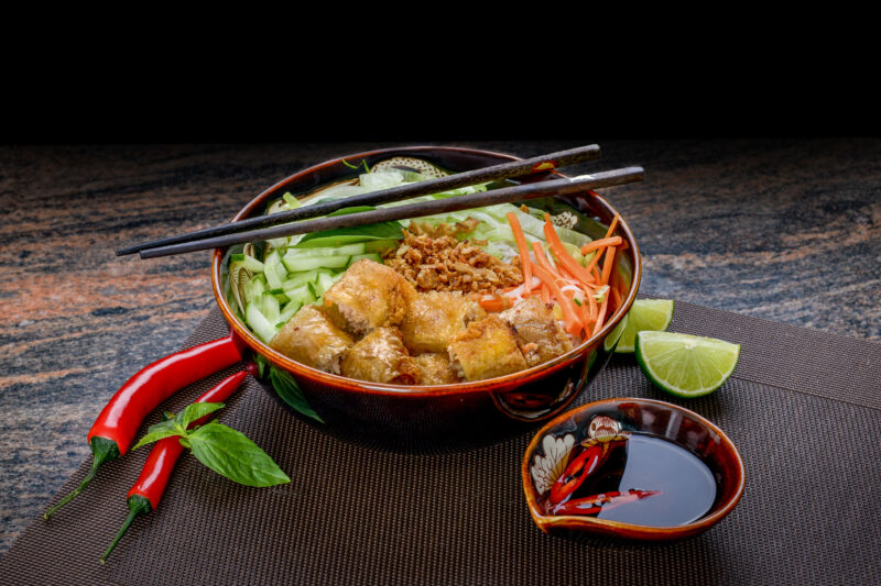 Bun Bo Nem ist frischer, leichter Salat mit in Zitronengras mariniertem Rindfleisch, Frühlingsrollen, frischen Kräutern und eingelegtem Gemüse, der aus Süden Vietnams kommt. Angerichtet auf einem Bett aus Reisnudeln und grünem Salat und außerdem mit süßer, salziger, scharfer und saurer Soße zugleich ist Bun Bo Nem nicht nur lecker, sondern auch gesund.